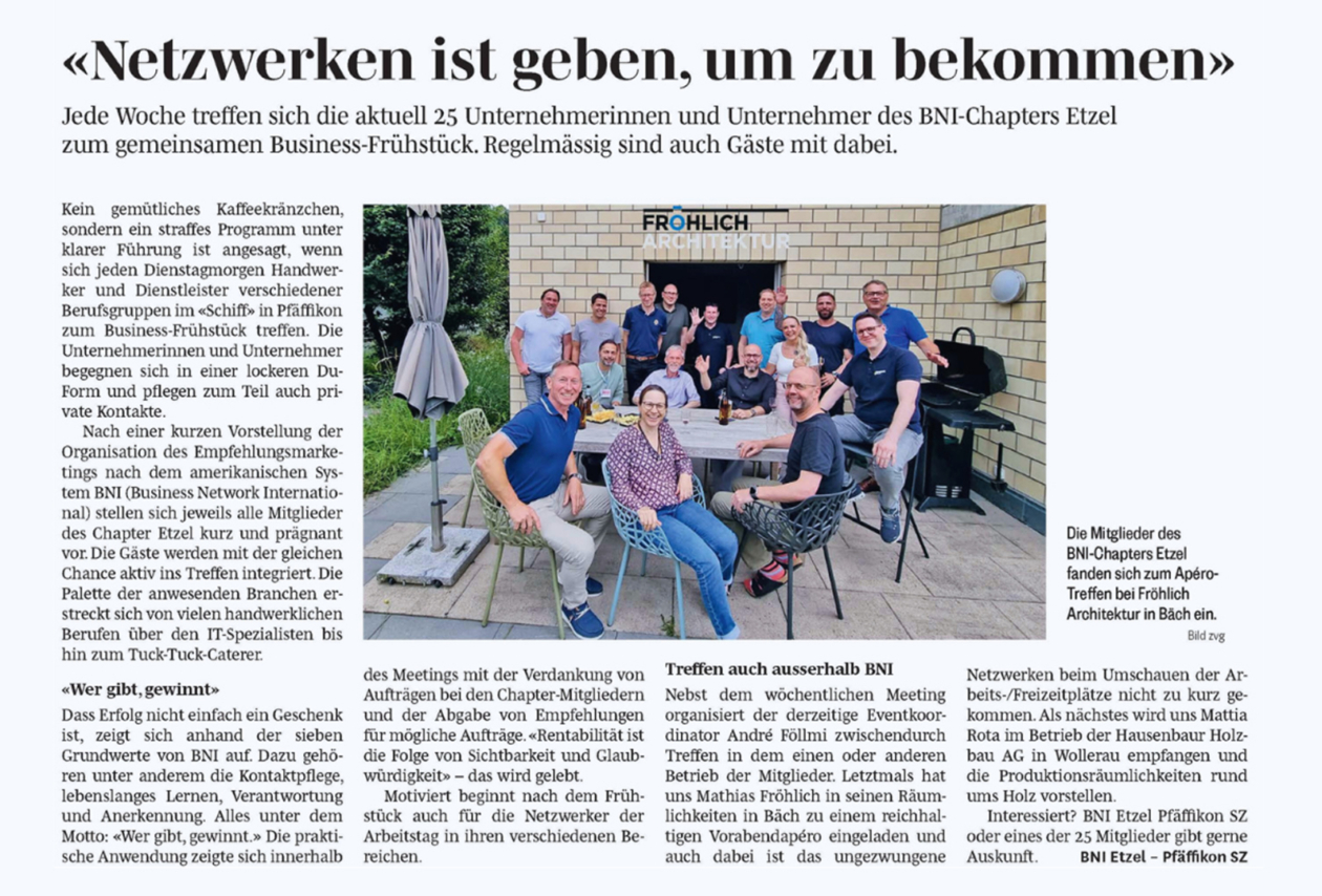 Die Mitglieder des BNI-Chapters Etzel besuchten die Fröhlich Architektur AG.