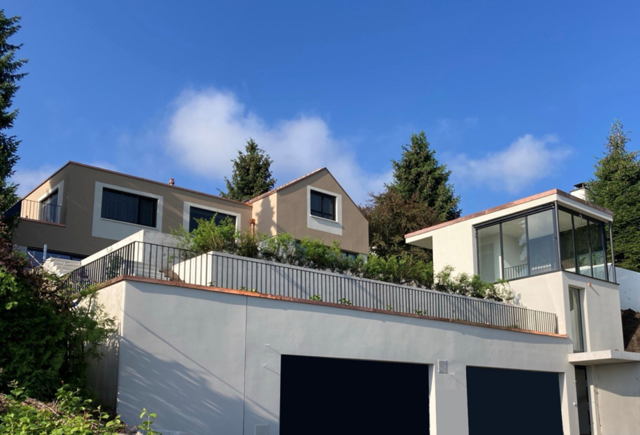 Das bestehende Einfamilienhaus sollte saniert und modern ausgebaut werden. Das grosse Satteldach wich einer modernen Flachdacherweiterung, welche den Blick auf den See öffnet. Der grosszügige Garten mit einer bereits vorbereiteten Grube für einen zukünftigen Pool wird dieses Zuhause zu einer grünen Oase über den Dächern machen.